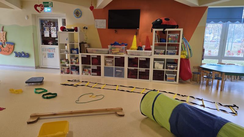 - Na wspólnym holu dzieci mogą korzystać z tablicy multimedialnej, sprzętu sportowego, tablic manipulacyjnych.